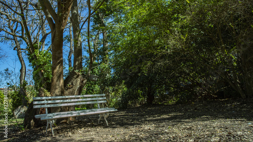 Empty white wooden bench from the house garden. concept of place to relax. White bench under the trees.