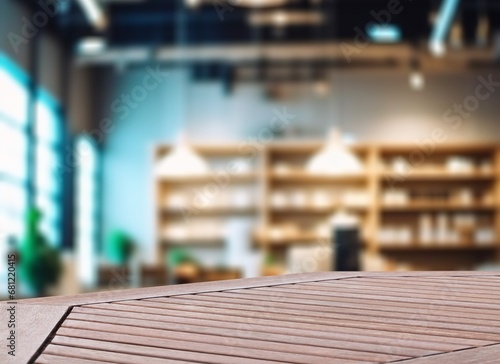 Empty wooden desk and blurred bokeh background