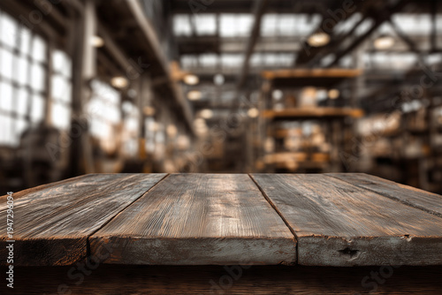 Empty Wooden Floor Foreground with Blurred Industrial Factory Warehouse Background for Product Display