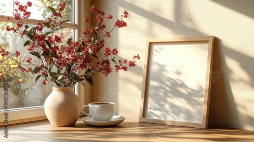 wooden frame, dried flowers, coffee cup, home office, minimalism, workspace, calmness, warm colors, aesthetic, creativity, interior design, charming, contemporary