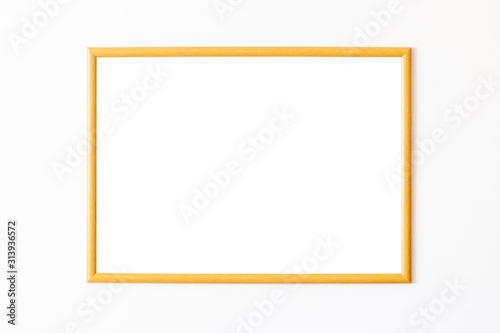 Empty wooden square frame in front of white wall