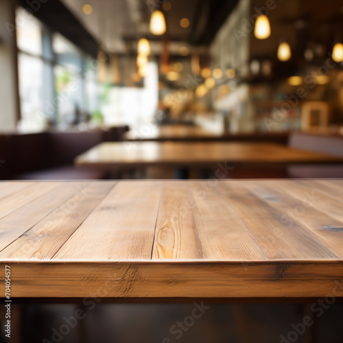 Empty wooden table in a restaurant with blurred background