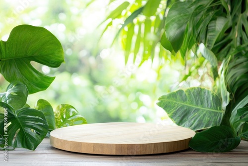 Empty wooden table surrounded by lush green tropical foliage in daylight setting