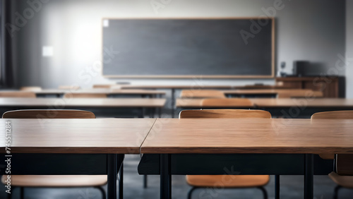 Empty wooden table top mockup with blurred empty classroom ai generated