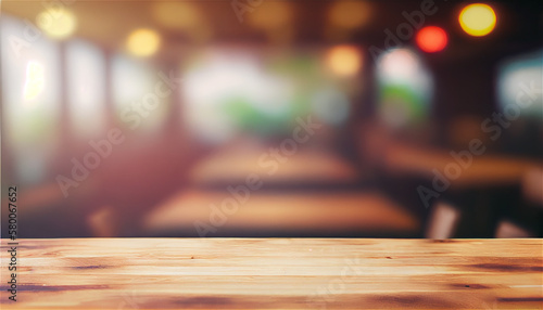 Empty Wooden top over defocused cafe interior, Generative AI