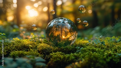 Enchanted Forest: A Glass Sphere Reflecting Sunset in a Mossy Grove