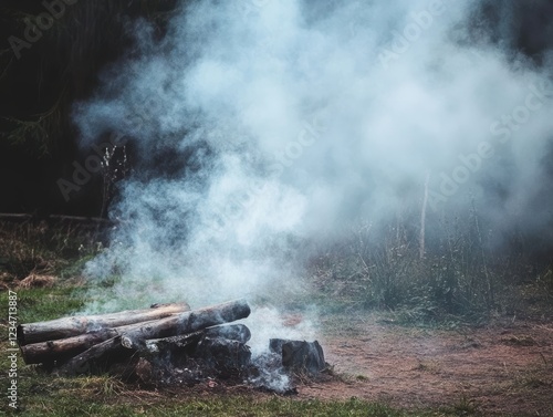 Enchanted Forest Gathering Concept. A smoldering campfire emits wisps of smoke in a natural setting, surrounded by greenery and a hint of wilderness.