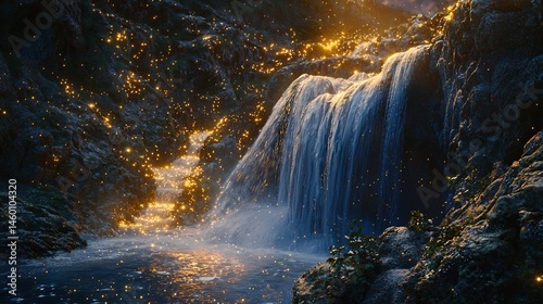 Enchanted waterfall flowing from glowing rocks fireflies flickering around cinematic magical realm