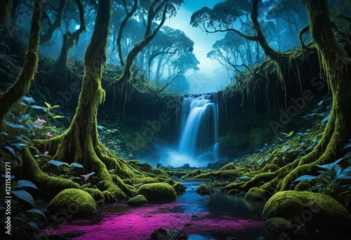waterfall, forest, mossy, mystical, fantasy, enchanted, nature, water, stream, river, tree, plant, leaf, moss, rock, stone, green, vibrant, magical, dreamy, aethereal, serene, peaceful, tranquil, calm, twilight, blue, dark, shadow, light, sun, ray, jungle, rainforest, hidden, secret, secluded, photo, digital artwork, illustration, artwork, background, wallpaper, desktop, hi-res, image