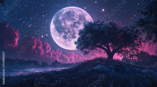 Enchanting August 2022 Full Moon Illuminating Serene Landscape with Vibrant Colors and Starry Night Sky