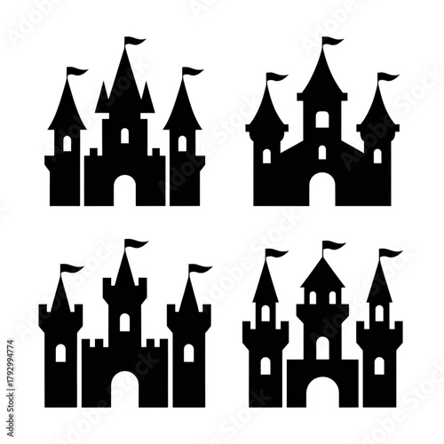 castle, fairy tale, fantasy, mediaeval, structure, architecture, royalty, monarch, kingdom, fortress, stronghold, citadel, keep, tower, battlement, illustration, design, graphic, icon, symbol, emblem, silhouette, outline, drawing, vignetting, simple, elegant, majestic, grand, impressive, iconic, story, legend, myth, dream, magical, whimsical, children