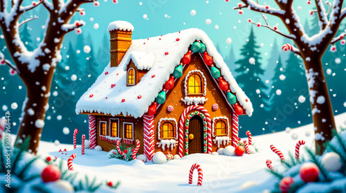 enchanting, gingerbread, house, illuminated, snowy, forest, surrounded, candy, cane, festive, decoration, whimsical, holiday, scene, warmth, magic, christmas, cosy, light, winter, wonderland, sweet, magical, charming, fairy tale, frosty, cheerful, sugary, joyful, snowflake, christmas, nostalgic, decorated, sparkling, celebration, whimsy, merry, frosted