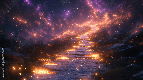 Enchanting glowing pathway leads into a celestial night sky filled with stars
