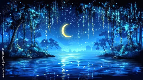 moon, night, lake, tree, forest, magic, fantasy, blue, glow, star, water, dark, serene, calm, peaceful, enchanted, whimsical, mystical, nature, landscape, art, illustration, digital, painting, drawing, wallpaper, background, cover, design, beautiful, dreamy, romantic, crescent, moonlight, sparkle, glistering, light, shadow, silhouette, river, duck pond, foliage, branch, leaf, willow, tranquil, luminescent, aethereal