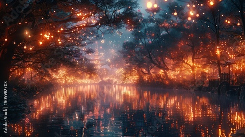 Enchanting Night Festival with Glowing Lanterns Reflecting on a Serene River Surrounded by Illuminated Trees