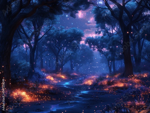 Enchanting night forest scene with glowing plants, a stream, and starry sky.