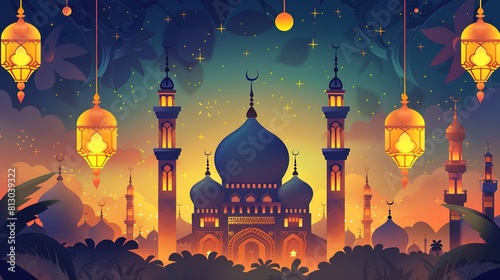 Enchanting night scene with mosque, stars and hanging lanterns.