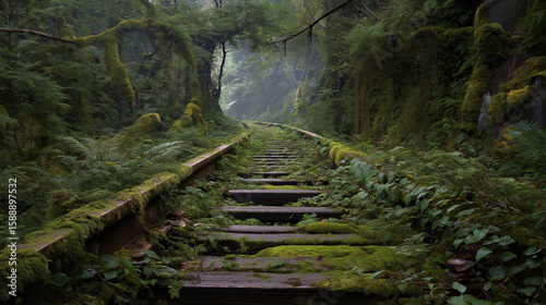 moss, fern, dark green, emerald green, serene, tranquil, peaceful, abandoned, forgotten, mystery, adventure, travel, background, wallpaper, marketing, advertising, design element, long exposure, depth of field, railway, train track, rail, sleeper, wood, metal, texture, pattern, overgrown, wilderness, jungle, rainforest, natural, organic, calmness, calm