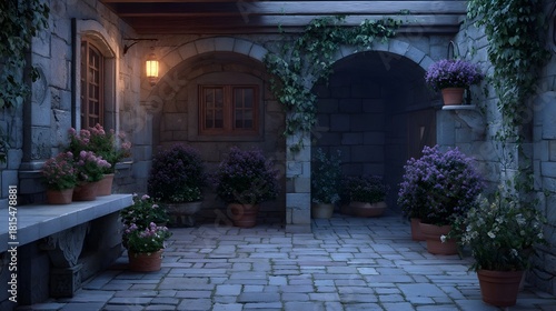 courtyard, dusk, stone, flower, lantern, serene, architecture, twilight, patio, masonry, cobbled, pavement, arch, alcove, window, wooden, light, glowing, evening, garden, plant, potted, blooming, floral, greenery, vine, ivy, rustic, old, ancient, weathered, textured, detailed, tranquil, peaceful, quiet, atmospheric, moody, ambient, shadow, illumination, european, mediaeval, classic, elegant, decorative, traditional, picturesque