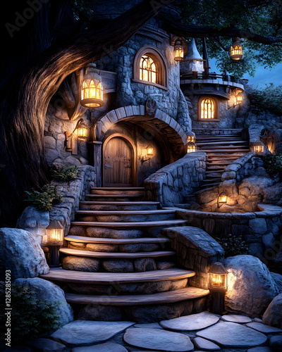 house, stone, night, enchanting, fantasy, fairy tale, background, game, magical, castle, tree, stair, light, lantern, architecture, magic, mystical, whimsical, dreamlike, romantic, mysterious, dark, cosy, home, bungalow, dwelling, building, scene, illustration, design, artwork, digital, art, image, picture, photo, graphic, visual, element, setting, ambience, mood