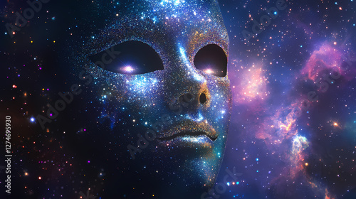 Enchanting surreal portrait of a cosmic masked figure set against a vibrant glowing backdrop of shimmering stars nebulae and ethereal cosmic atmosphere. Glowing Ethereal Masks. Illustration
