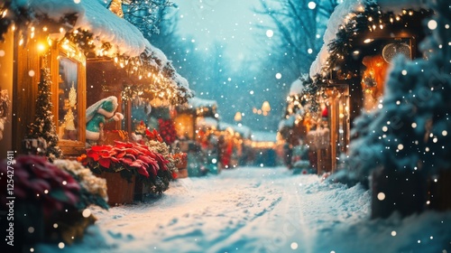 Enchanting Winter Wonderland with Christmas Market Stalls and Snowy Pathway Surrounded by Twinkling Lights