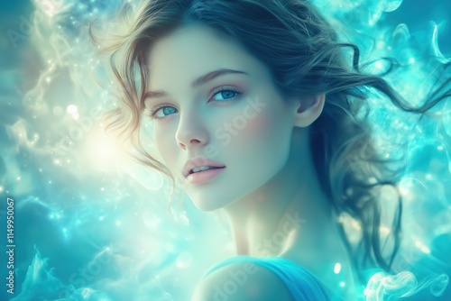 woman, portrait, dreamy, hair, model, make-up, skin, closeup, coiffure, winter, glamour, people, fairy, snow, person, lady, cosmetic, art, eye, aethereal, blue, light, fantasy, soft, magic, beauty, face, mystical, floating