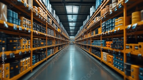 warehouse, inventory, shelf, storage, logistic, distribution, product, box, cardboard box, industry, business, commerce, retail, wholesale, supply, chain, management, organisation, efficiency, productivity, aisle, row, depth, perspective, interior, building, structure, industrial, commercial, orange, yellow, blue, black, stacked, organised, orderly, systematic, arrangement, good, merchandise, stock