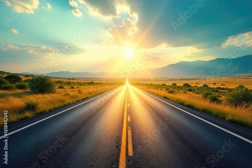 Endless asphalt ribbon vanishing into the hazy distance, sun-drenched landscape stretching towards the horizon A scenic summer highway journey awaits , road trip, asphalt, freedom