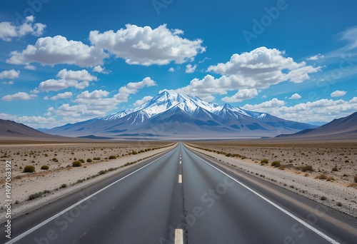 Endless open highway leading to snow capped mountains under a bright blue sky with scattered clouds
