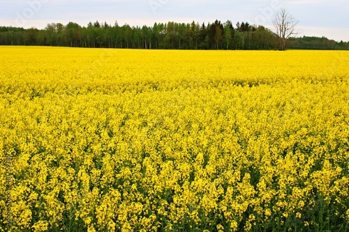 Endless rapeseed fields bloomed with beautiful yellow flowers on warm May days