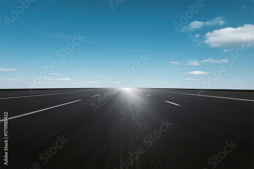 road, sky, sunlight, horizon, clear, blue, open, highway, straight, perspective, empty, drive, travel, journey, destination, avenue, pavement, asphalt, white, line, shine, bright, daytime, landscape, scenery, view, natural, environment, transportation, speed, motion, forward, direction, sun, glare, distance, space, huge, wide, clearance