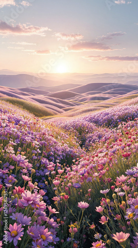 Endless rolling meadows stretch toward the horizon, painted with wildflowers in shades of lavender, pink, and gold. peaceful, dreamy and poetic, deeply immersive.
