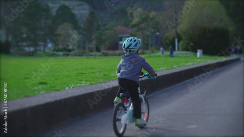Energetic little boy riding bicycle outdoors at park, child wearing protective helmet rides bike