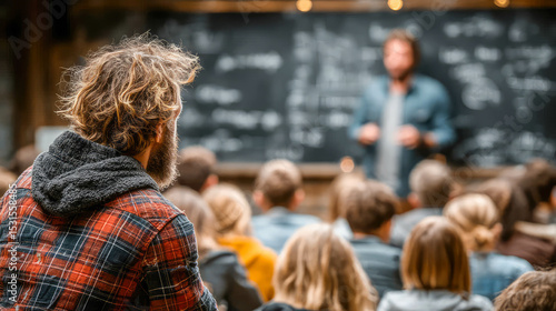 teacher, classroom, blackboard, student, male, casual attire, lecture, book, education, teaching, blackboard, prof, instructor, learning, goggles, bookshelf, cognition, class, interaction, denim, smiling, casual clothes, school, group, attention, children, young, guidance, friendly, engaged, cosy, speaker, academic, informal, communication, mentor, sharpened, indoor, handwriting, presentation, youth, reading, modern, visual, study
