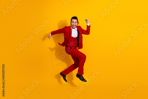 man, male, photogenic, red, suit, jacket, shirt, pant, shoe, black, background, yellow, jumping, pose, smile, smiling, fun, fashion, model, glamour, trendy, stylish, cool, elegant, gentleman, funny, holiday, party, celebration, festive, promotion, advertisement, shopping, sale, discount, day, christmas, tuxedo, brunet, event, style, vogue, chic, attitude, energy, bold, carefree, positive, up