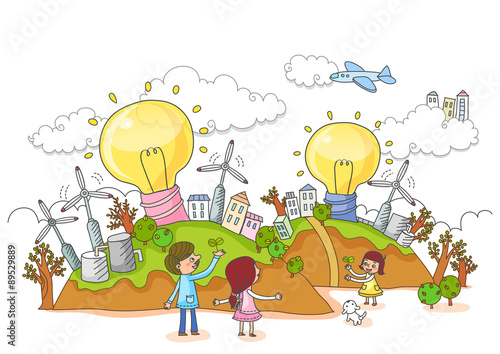 energy, illustration, cloud, aeroplane, electricity, tree, building, home, puppy, animal, germinating, economy, invention, idea, environmental protection, person, man, girl, adult, children, three people