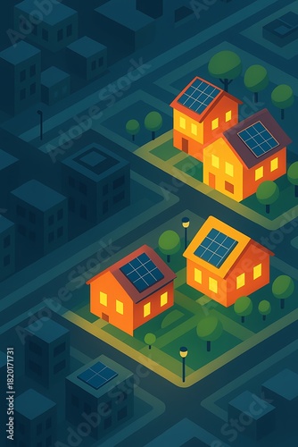energy, poverty, inequality, contrast, isometric, city, neighbourhood, home, house, lit, illuminated, dark, electricity, access, divide, disparity, solar, panel, rooftop, night, orange, yellow, blue, green, tree, street light, residential, urban, injustice, unfair, comparison, difference, awareness
