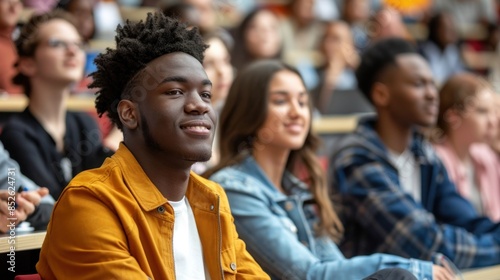student, lecture, classroom, diverse, engaged, modern, bright, education, learning, listening, sharpened, university, college, academic, teaching, young, group, attentive, happy, smiling, jean, jacket, curly, hair, multicultural, audience, lecture hall, seated, notebook, youth, higher education, together, friendly, peer, educational, crowd, focused