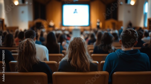 Engaging audience at a conference with a presentation displayed on a large screen in a spacious hall : Generative AI