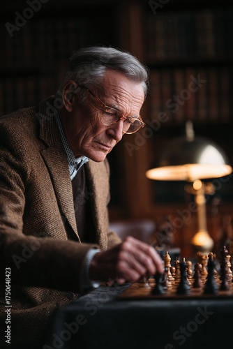 chess, man, senior, strategy, game, wisdom, intellectual, competition, board, player, thoughtful, focused, concentrated, thinking, vintage, library, learning, ageing, retirement, bequest, intelligence, hobby, lifestyle, cognition, challenge, planning, foresight, life events, aged, mature, eyeglass, tweed, jacket, pawn, king, queen, rook, knight, bishop, decision, move, opponent, dark, light, table, wood, room, indoor, mind