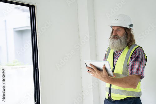 Engineer builder. Foreman use tablet computer working in construction site. senior worker project designer leader concept.