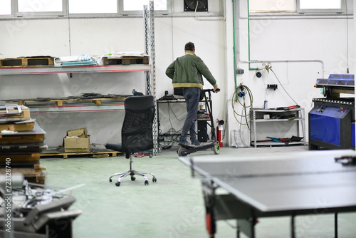 engineer in an electronic repair shop workshop rides electric scooter in a factory