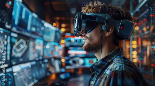 Engineer in virtual reality headset immersed in high-tech lab environment