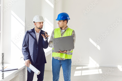Engineer or architect consulting builder, explaining details of apartment construction and real estate renovation. Construction team standing in safety hard hats in apartment with laptop and blueprint