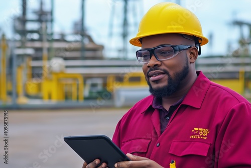 Engineer wearing a hard hat and holding a tablet at a construction site