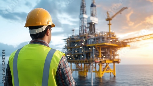 Engineer wearing safety vest and hardhat looking at oil rig, offshore platform in the ocean at sunset.