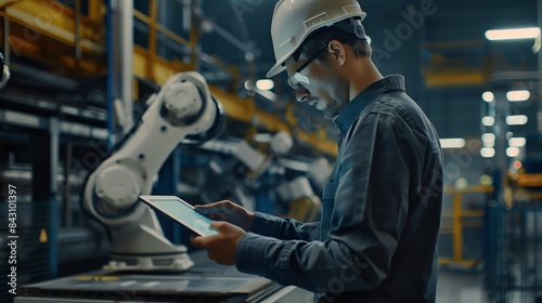 Engineer with tablet operating automation robot in modern factory for industrial production and technology innovation.