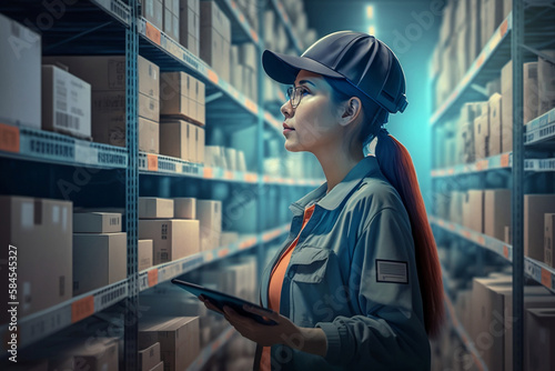 engineer woman order details checking goods and supplies on shelves with goods background in warehouse, generative ai