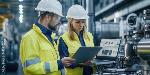 Engineers Analyzing Data for Industrial Process Improvement. Two engineers in high-visibility vests and hard hats analyzing data on a laptop to improve industrial processes in a factory.
